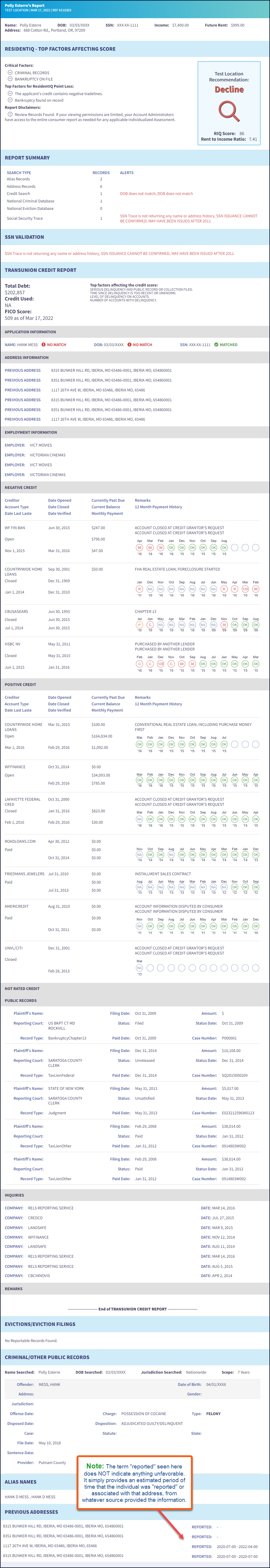 Eviction Filings: If there is a legal record of eviction, then the information will be reported here.