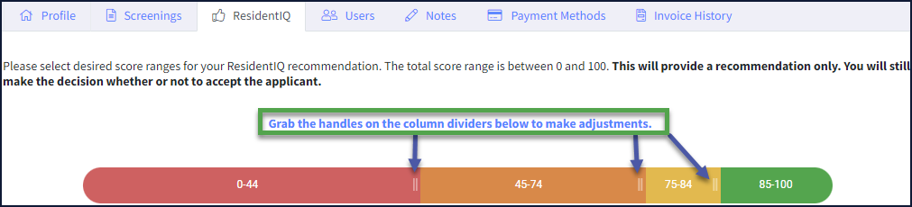 You should now see a bar that shows the current settings and allows you to adjust those settings. To adjust them, simply grab the column dividers and move them left or right, to the desired score for each recommendation (Approved, Conditional-High, Conditional-Low, and Decline).
